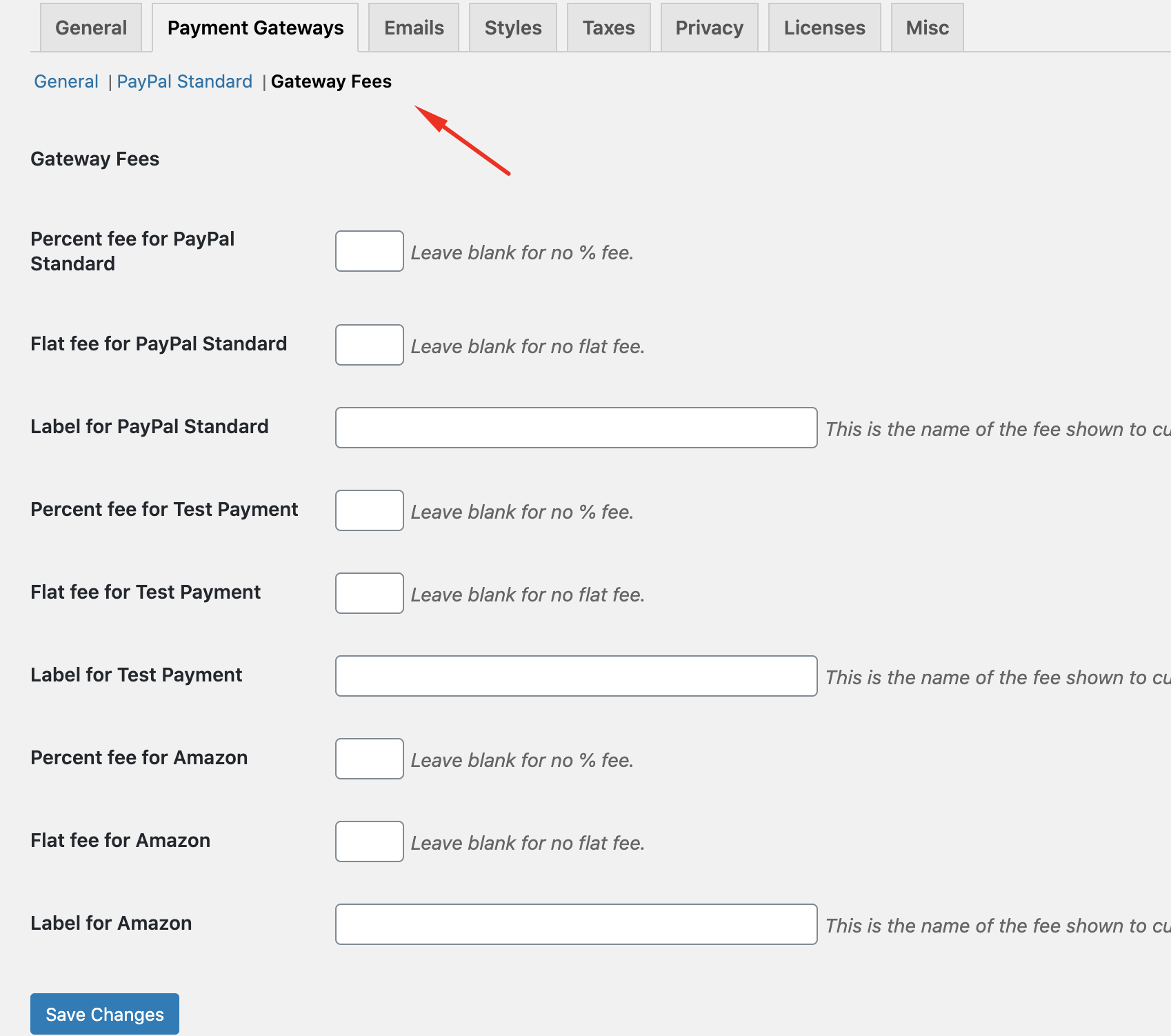 installed and activated, in your EDD store, go to Downloads → Settings → Payments and find the Gateway Fees section. It’ll look like this:
