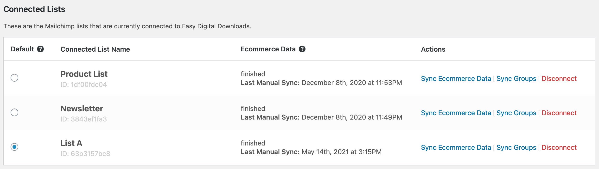 - Choose a default list. Under “Connected Lists” the first column shows which list is the default list. This list is the one that will be used at checkout when customers choose to join the list.