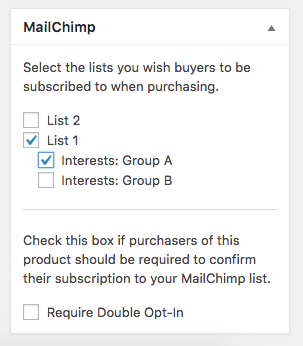 You can also choose one or more Mailchimp mailing lists you’d like a customer to be subscribed to when they purchase a specific product. Do this by going to the product’s edit screen and selecting the list(s) you wish customers to be added to in the “Mailchimp” box. In this section, you can also select whether to subscribe customers to specific groups within the list. If a list has one or more groups, the group(s) will be shown as an additional checkbox that is indented below the main list name, like this: