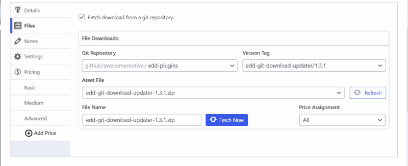 1. The “Download Files” metabox on the download edit screen will now have a checkbox labeled “Fetch download from a git repository.”