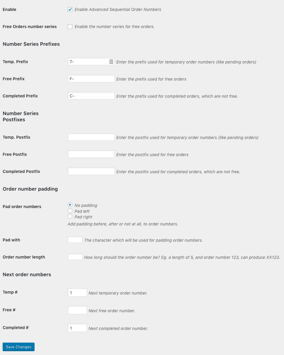 Once an order is completed, if the order total is 0, the order will be assigned an order number from this order series. Different order numbers for free orders can be disabled in the plugin settings.