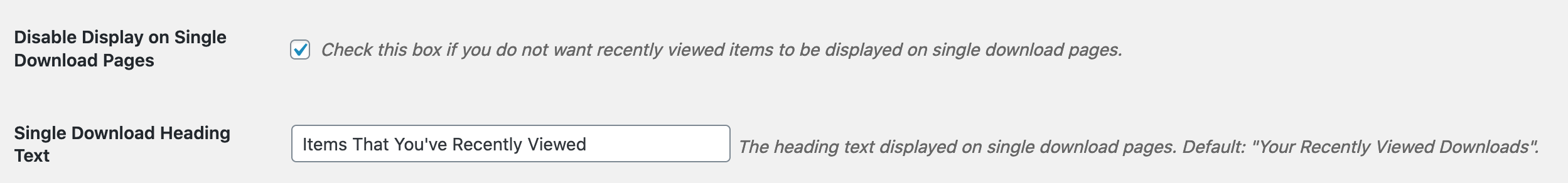 Single Download Heading Text – Allows you to supply a custom heading above the recently viewed items.