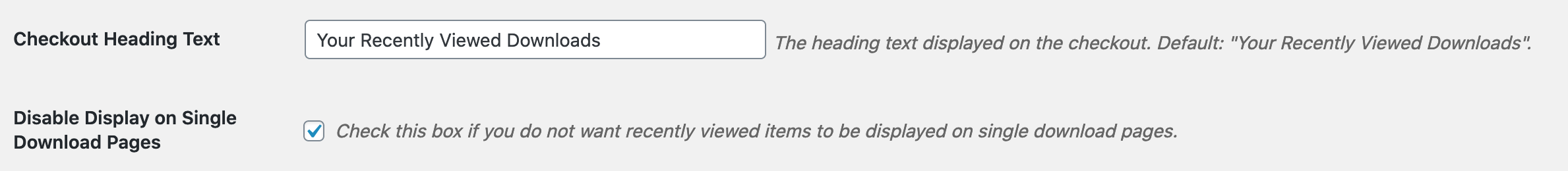 Disable Display on Single Download Pages – This turns off the automatic display of recently viewed items on single product pages. This is useful if you want to do things manually, use the widget instead, or just show them only on the checkout page.