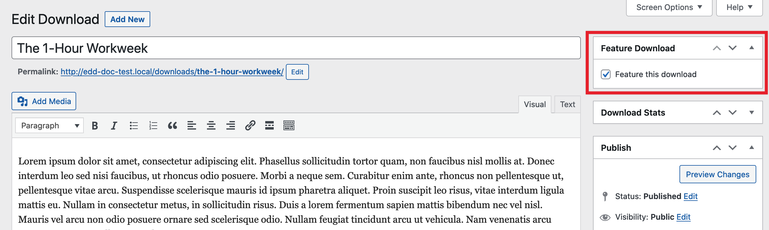 After you have installed and activated the Featured Downloads extension, you can find the option to make a Download “featured” by navigating to Downloads → All Downloads and either creating a new Download or editing an existing Download.