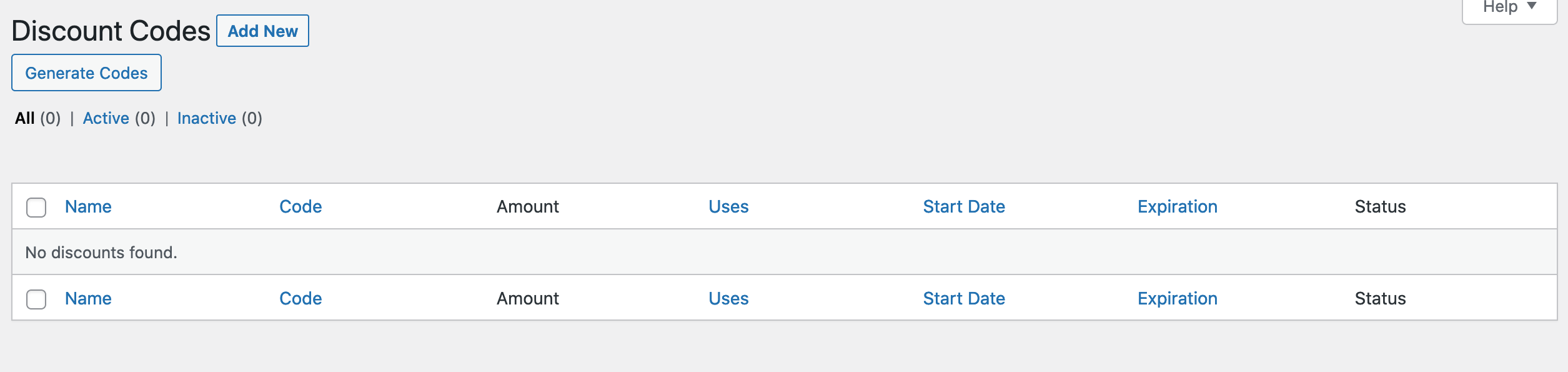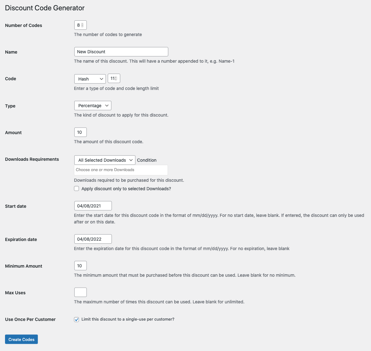 After you have installed and activated the Discount Code Generator extension, you will then navigate to Downloads → Discount Codes. You will see a “Generate Codes” button that will be used to generate the discount codes.