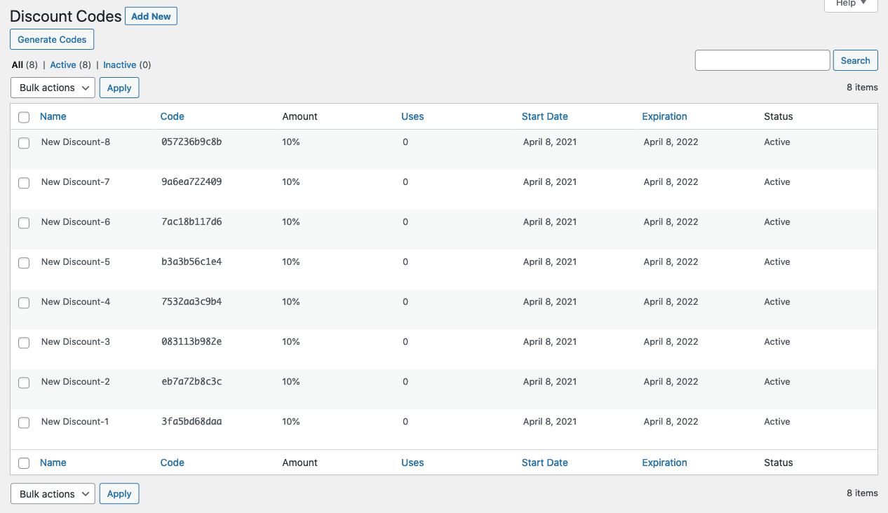 Once the settings are in place, click the “Create Codes” button and your discount codes will be automatically generated.