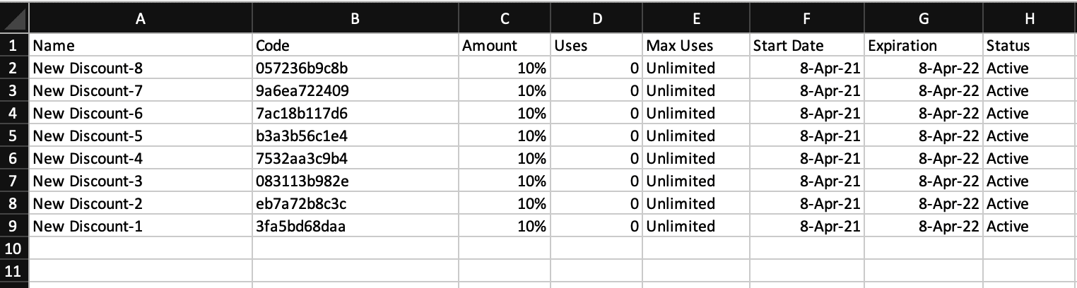 You will then be given a .csv file containing all Discount Codes.