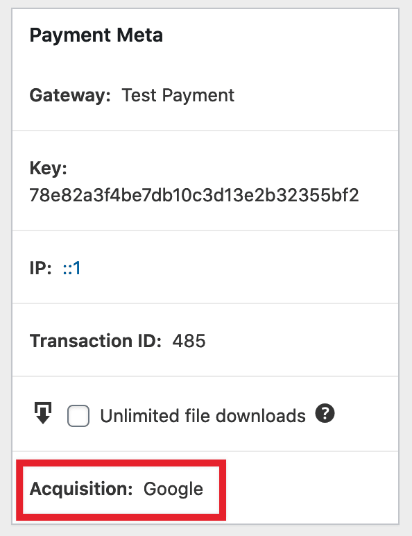 You can also see which acquisition method was recorded when viewing payment records in Downloads → Payment History. The acquisition information will be available in the Payment Meta section of each payment record.
