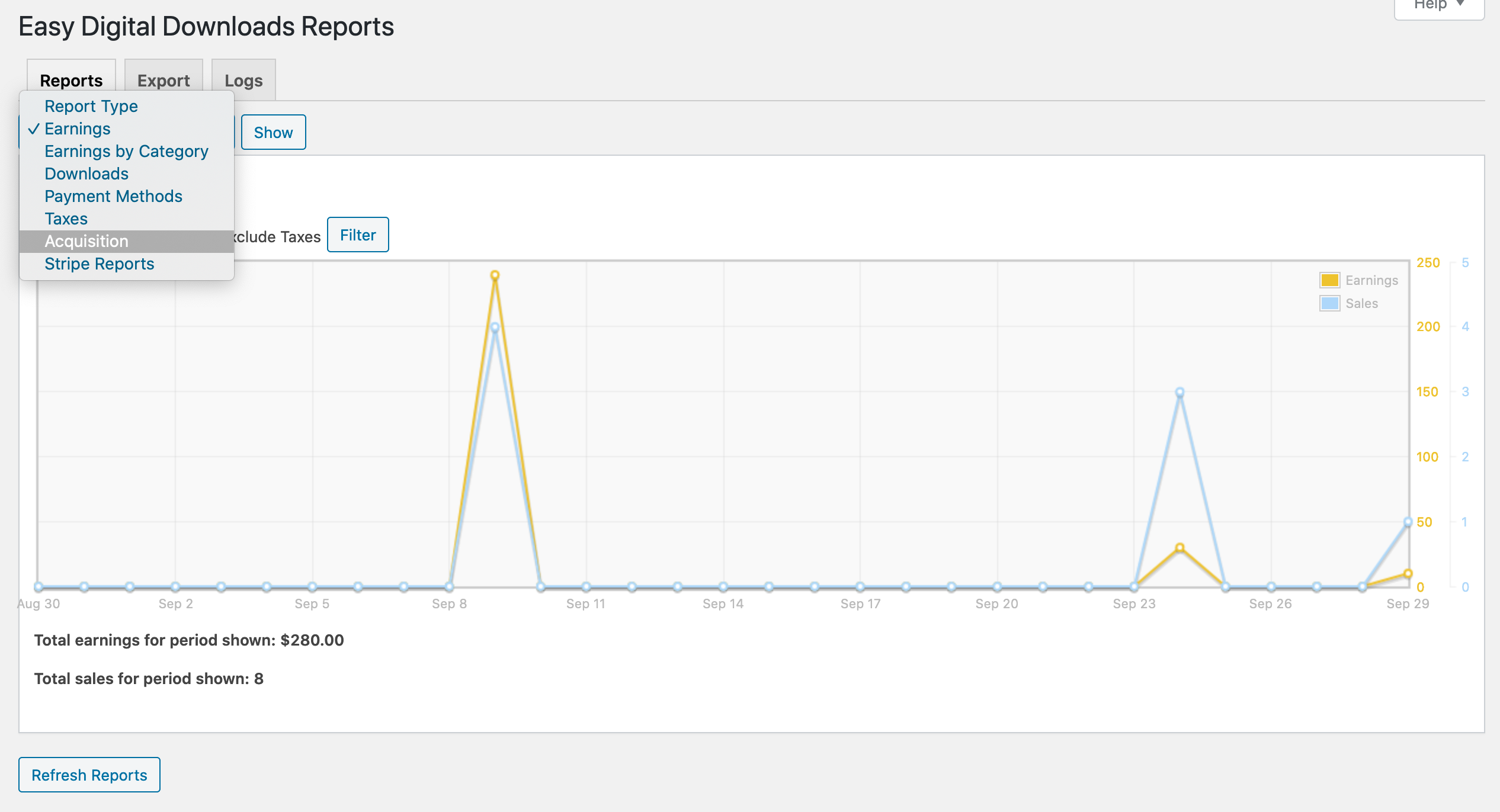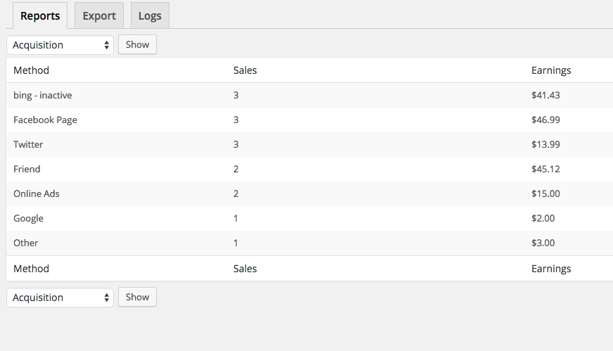 To view reports navigate to Downloads → Reports and choose ‘Acquisition’ from the dropdown list then click ‘Show’.