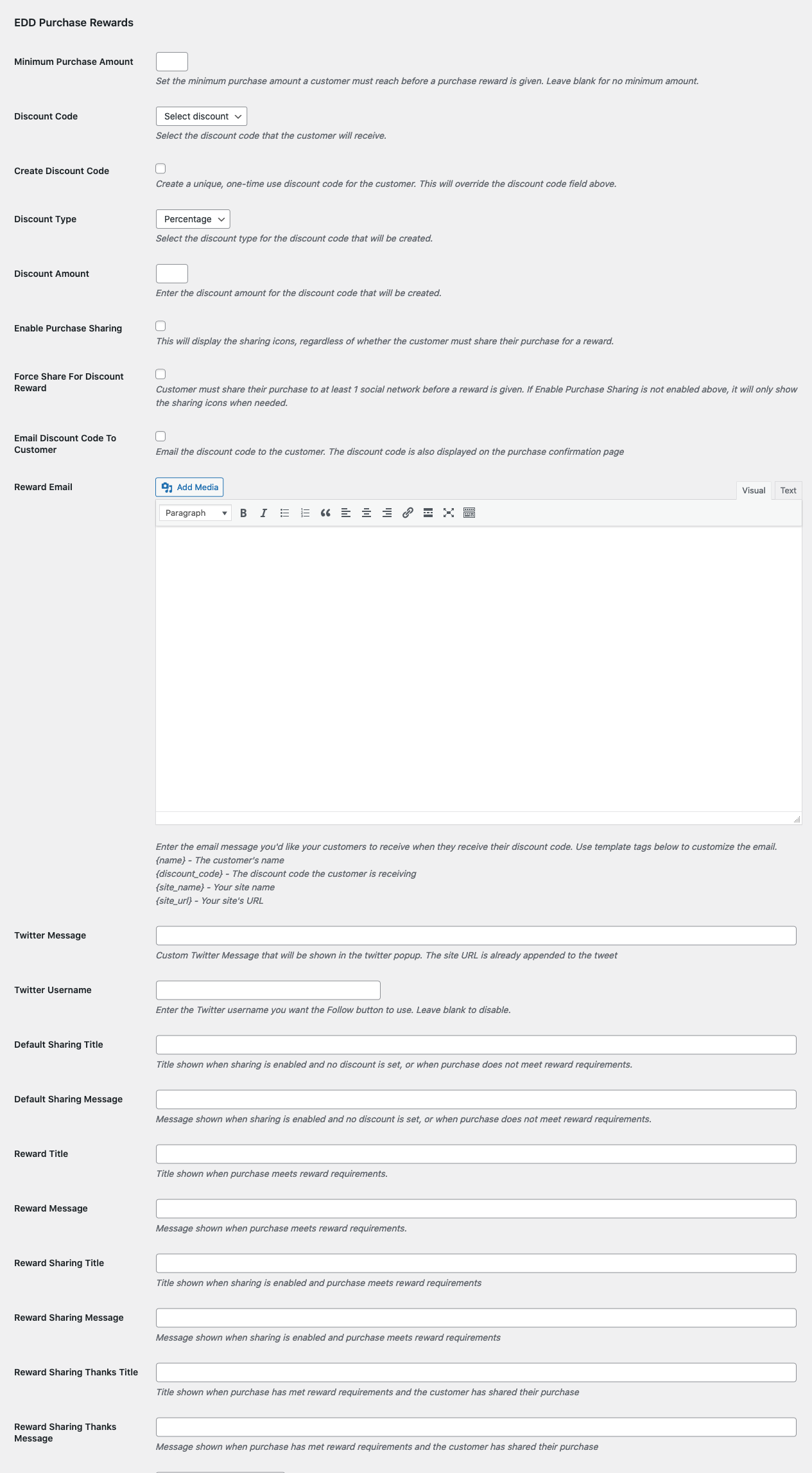 Minimum Purchase Amount: This would require that the customer spend a certain amount of money on a single transaction before the reward would be given. If you leave it blank then there is no minimum. If you choose to set a minimum, put in only the number, not any currency symbol.