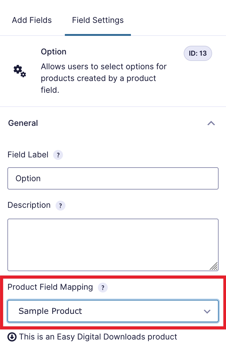 Once the “Option” field is in place, select a Download from the “Product Field Mapping” dropdown menu.