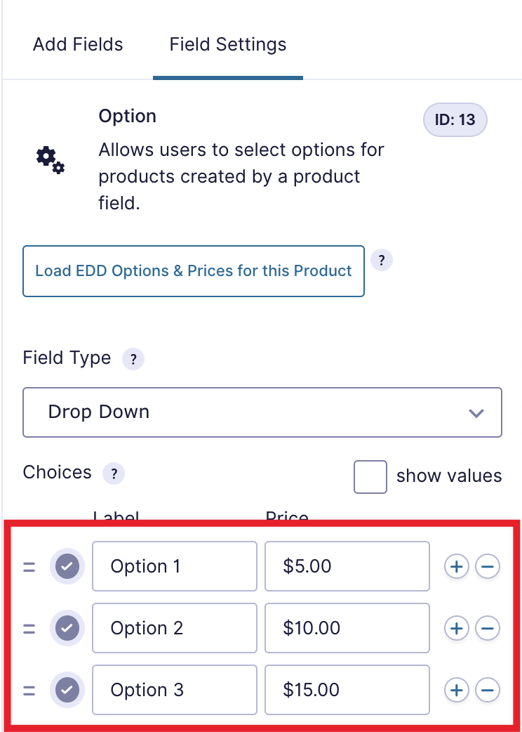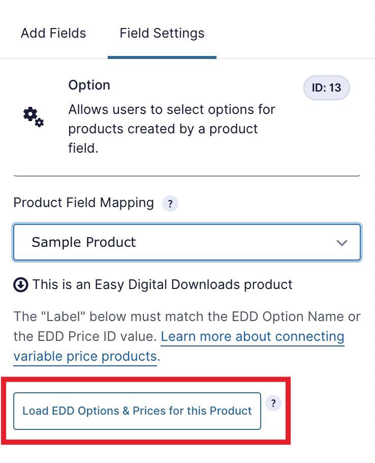 The easiest way to connect the Gravity Forms option choices to Easy Digital Downloads price variations is to give them the same name. The EDD names are automatically loaded when you click the “Load EDD Options & Prices for this Product” button.