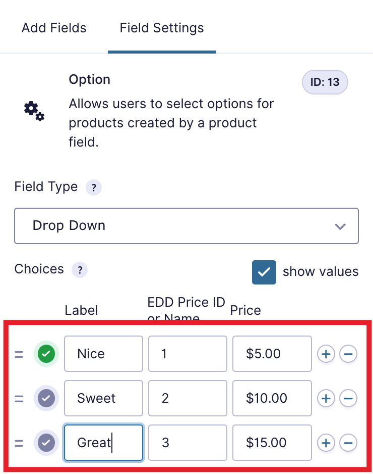 You can see in the next screenshot that the values that have been set are 1, 2, and 3. even though the names are different, it will be connected because those numbers match the EDD variation positions.