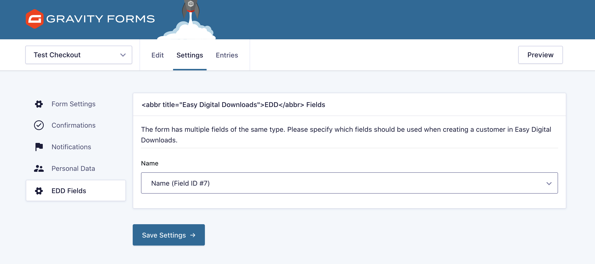 From the EDD Fields settings page, choose the field that will be used for the EDD Customer. By default, the first field of its type will be used.