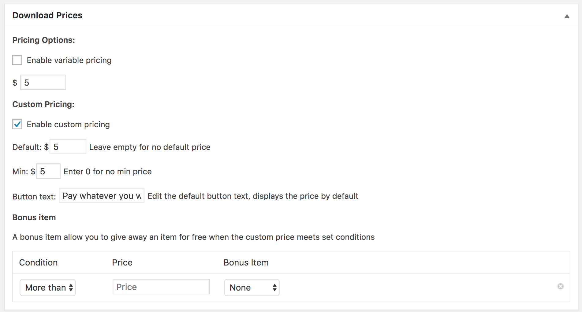 Dashboard → Downloads → All Downloads. Then, in the “Download Prices” metabox, click to enable custom pricing. You’ll have a few additional options there: