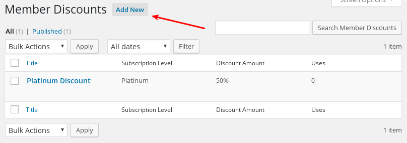 The options for creating a new discount are quite simple. You provide a Title, which will be displayed on the checkout form, choose a Subscription level, and then a percentage off the total cost.