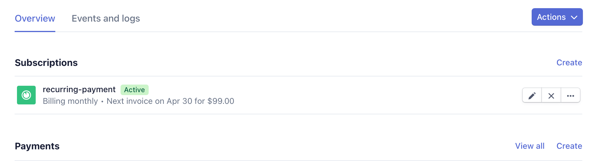 Once you’ve found and selected your Customer in Stripe you’ll see a list of subscriptions.