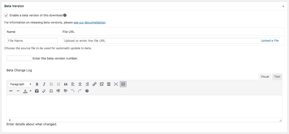 Once enabled, you will be asked to provide the version number, the beta download file, and the beta changelog.