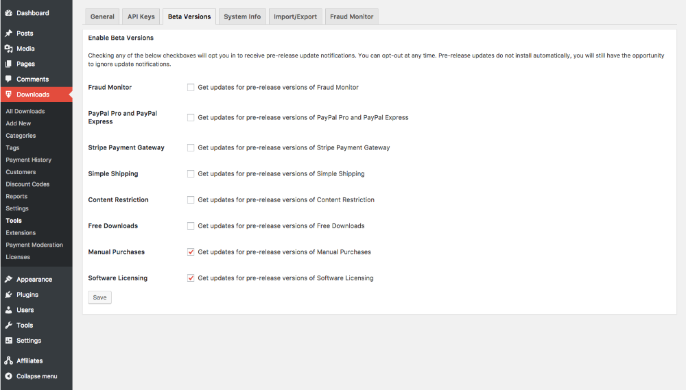 In our own usage of Software Licensing in Easy Digital Downloads, we have added a settings screen to our Tools menu that allows customers to opt into beta versions of our extensions. Here’s a screenshot of what that looks like: