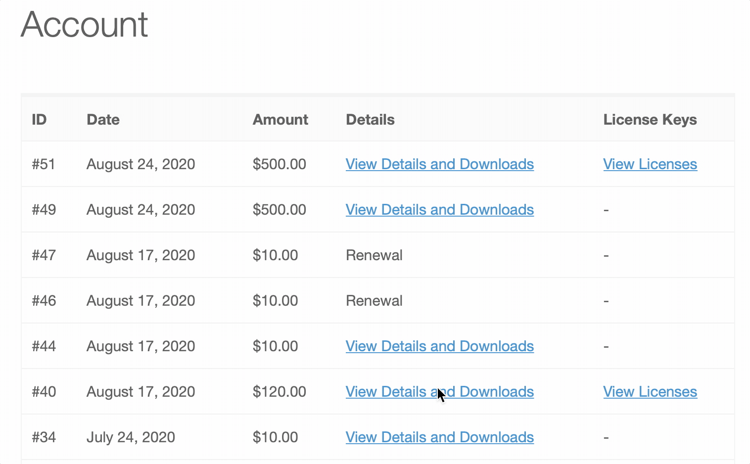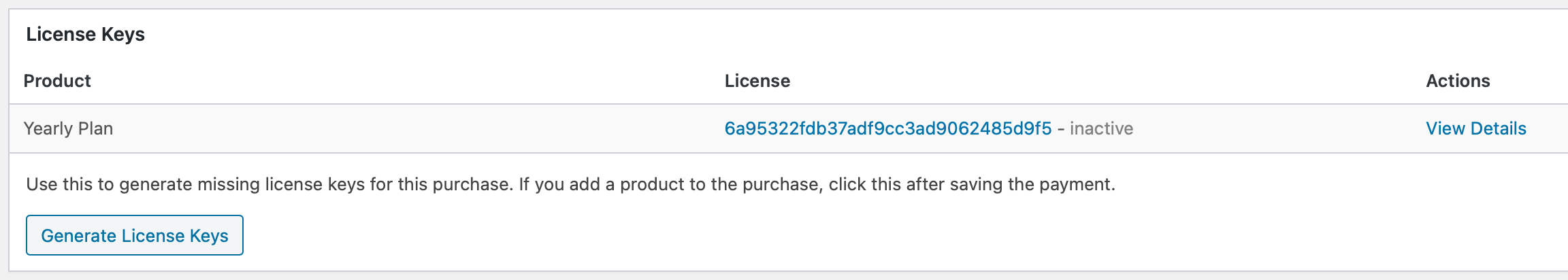 The Downloads → Licenses page provides an overview of all the license keys you have sold. Clicking the key will open the License Details. Several pieces of information are listed with each key: