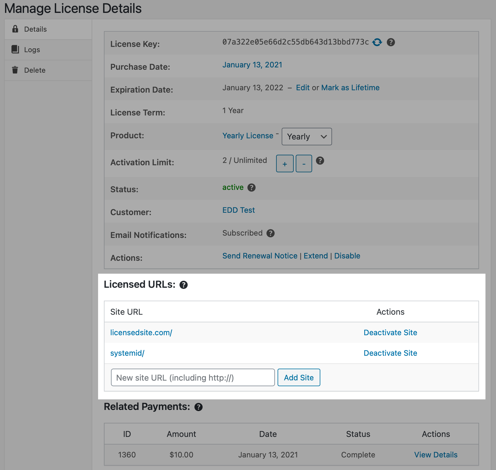Admins can manually manage the Site URLs on a per-license basis from the Manage License Details screen. If you wish to add or remove a site URL from the license, you can do it on this page: