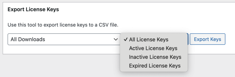 Licenses are exported under Downloads > Tools > Import / Export instead of being located under the reports export, in order to limit what roles can access licenses. You can export all licenses or export licenses by status. The file includes license key, status, customer information, product name, dates and activation information.