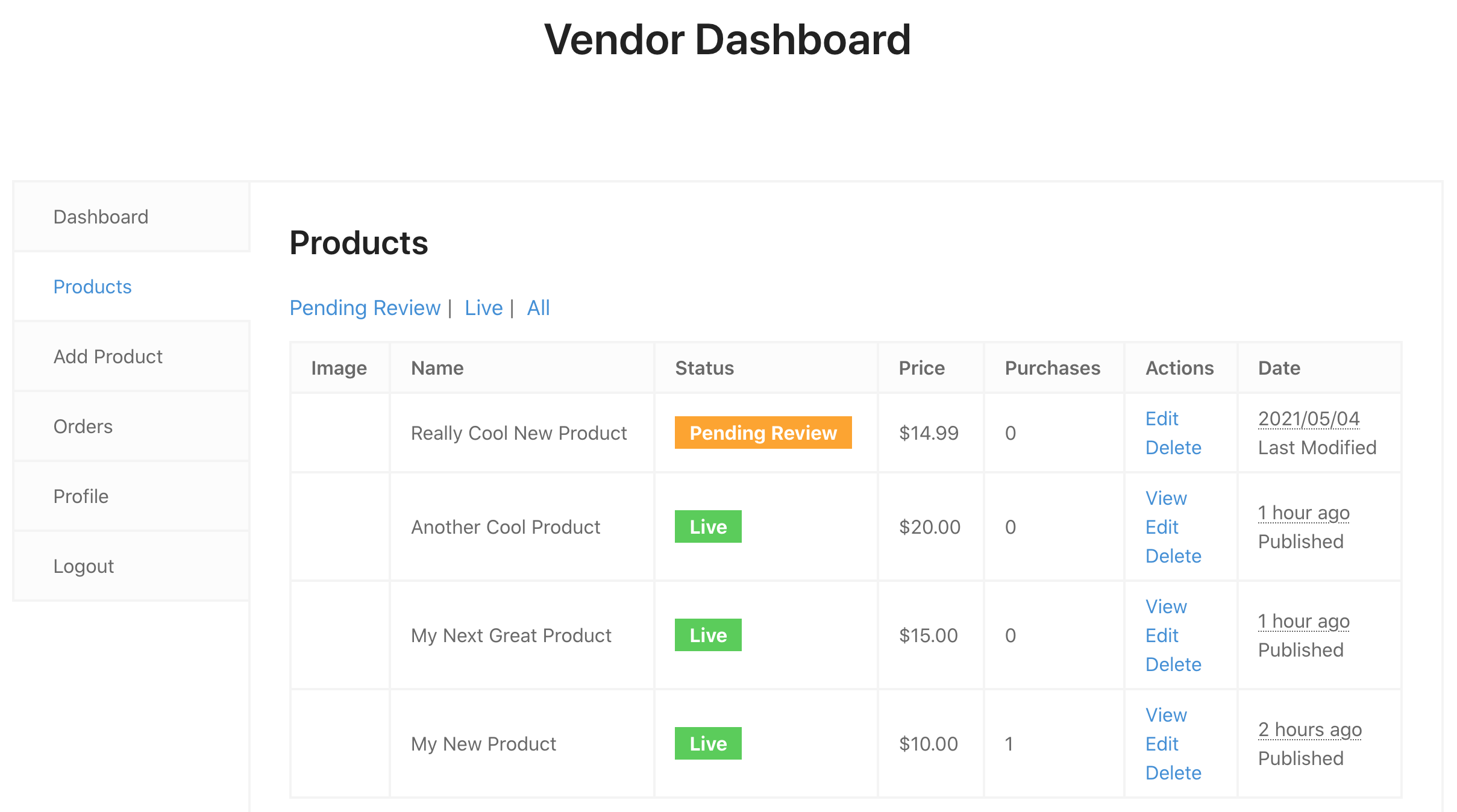 With Frontend Submissions the site owner can allow Vendors to add new products freely without review, or the site owner can require that each submission be held for moderation.