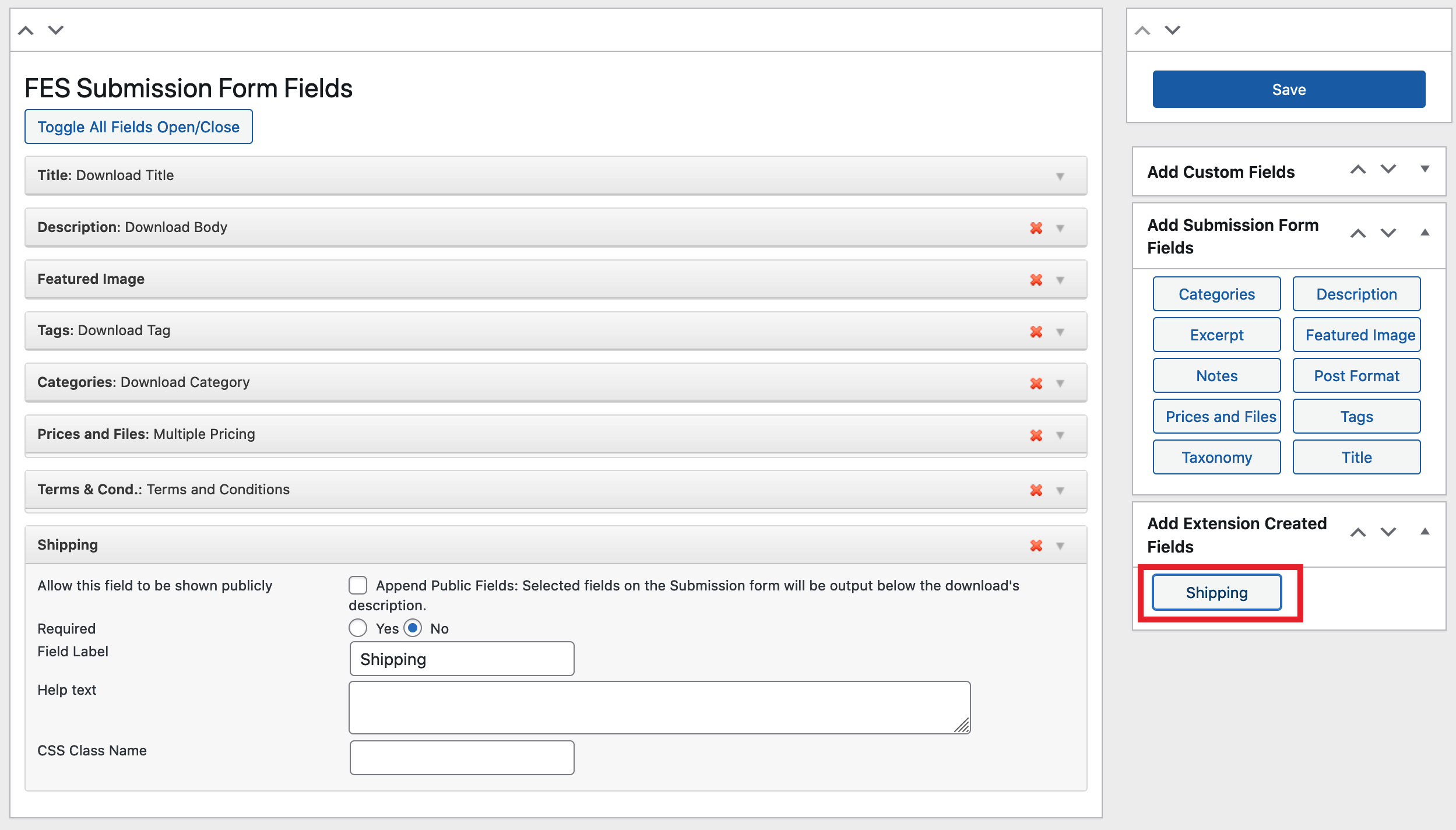 To allow Vendors to set their own shipping rates on their products, edit the Submission Form and add the “Shipping” field which can be found under Add Extension Created Fields. When this is in place, vendors who edit products will see two fields: Domestic and International shipping rates.