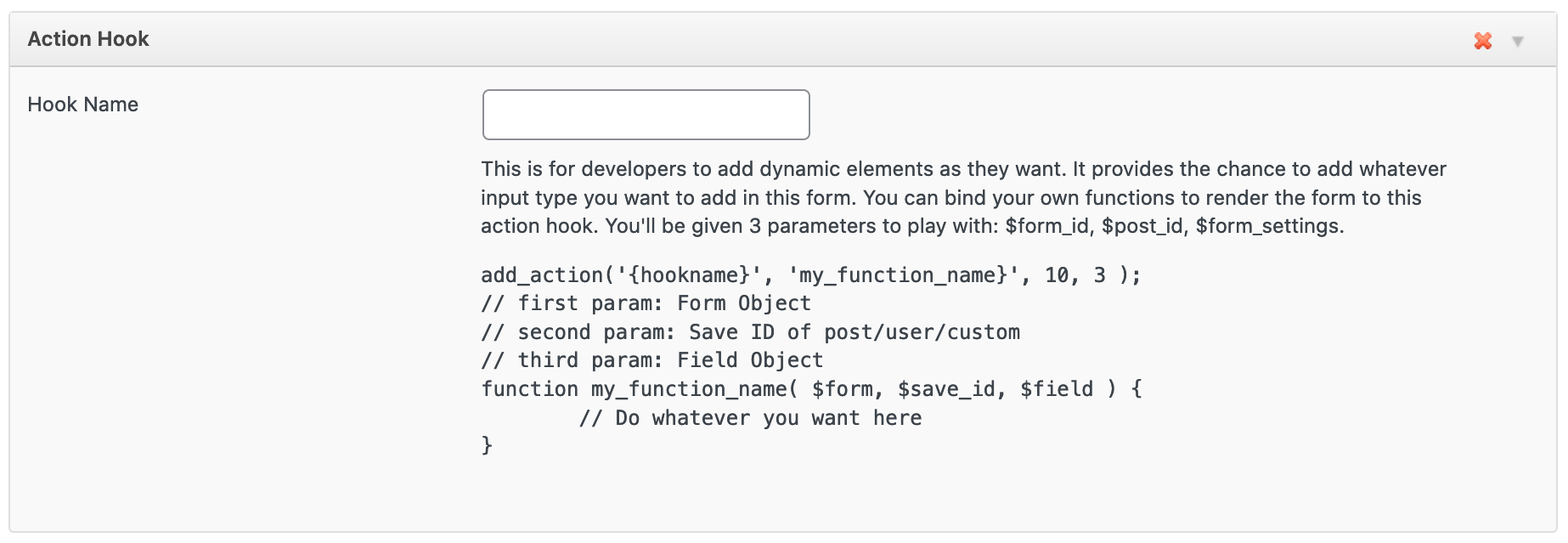 The Action Hook button doesn’t make a form field. Instead, it inserts a location for you to create a hook. Instructions for using it are included in the form builder itself, as seen below. This requires knowledge of coding and is meant for more experienced users.