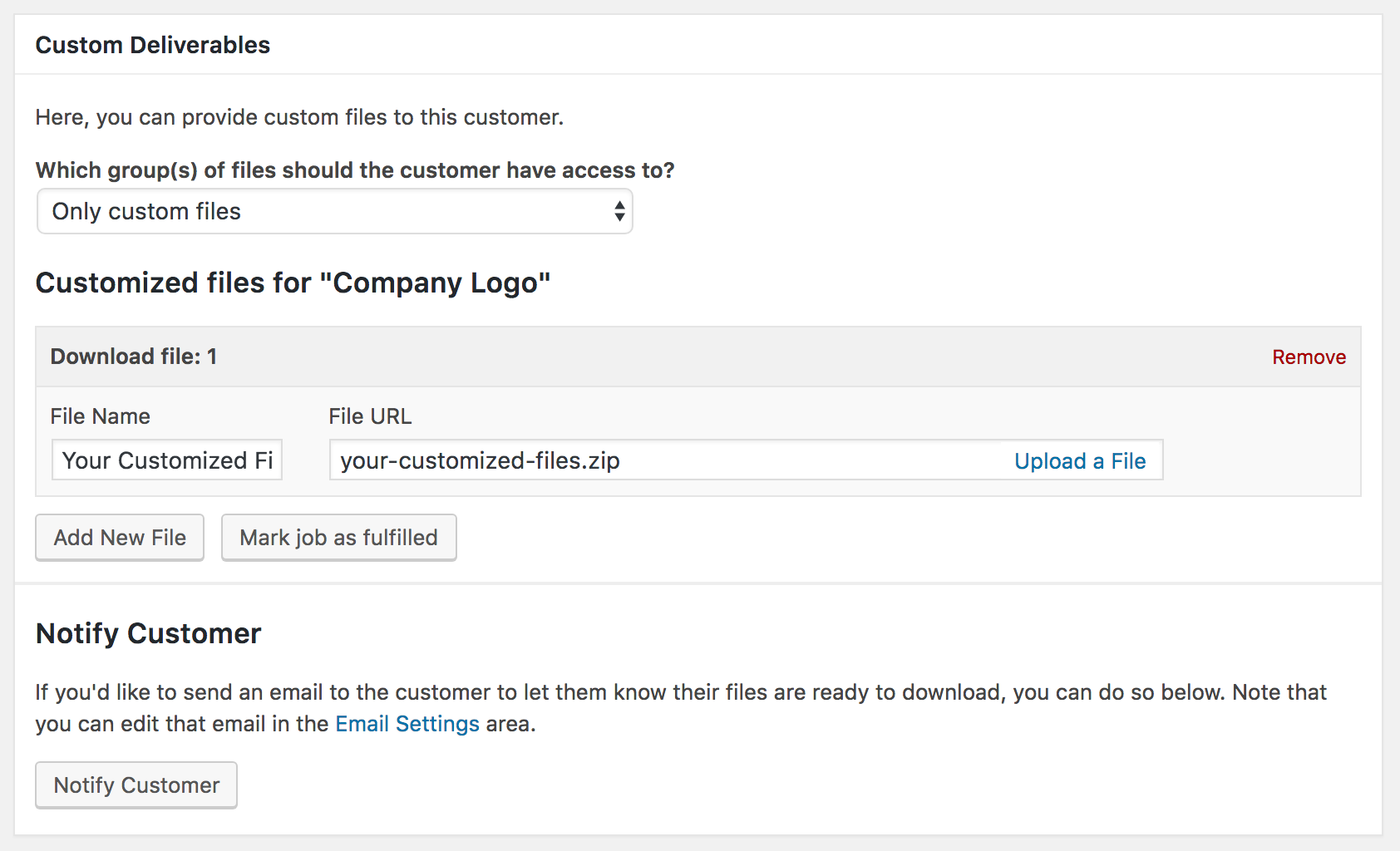 Once activated, there are no settings to configure. In all Order Details (Downloads → Orders → Order Details) a Custom Deliverables section will appear where you can upload and notify customers that custom file(s) are available for download.