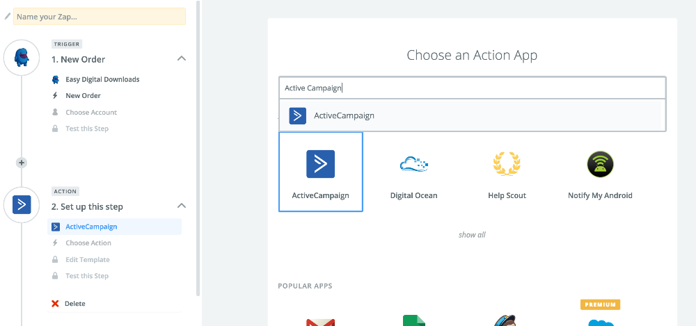 10. Now, go to the “Action” steps (which is step 2) and under “Choose an app” search for “Active Campaign”.