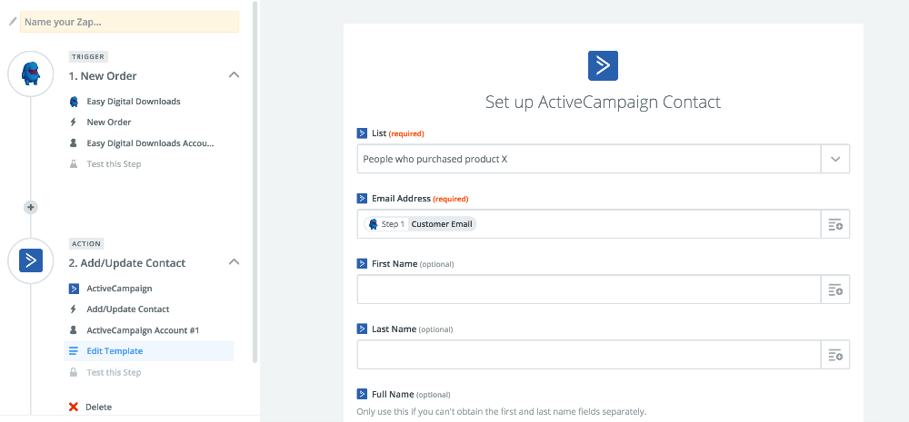 You can use Zapier to add your customer’s emails to your ActiveCampaign lists after they make a purchase on your Easy Digital Downloads shop. Here’s how: