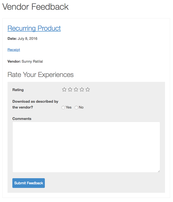 If customers buy a vendor’s product, they can leave feedback for the vendor. A link will be displayed on the customer’s Purchase History, which they can follow to supply feedback to the vendor. Links will only appear for products created by a vendor.