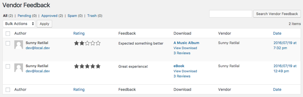 Reviews is fully integrated with Frontend Submissions. If customers buy a vendor’s product, they can leave feedback for the vendor from their Purchase History. Feedback results are available to the shop owner and vendors only; customers will not be able to view feedback results.
