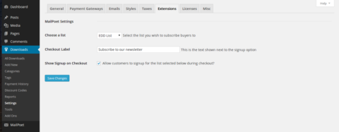 This extension integrates your Easy Digital Downloads store with MailPoet by letting you automatically subscribe customers to specific lists based on what they purchased, and allowing customers to opt themselves into a list during checkout.