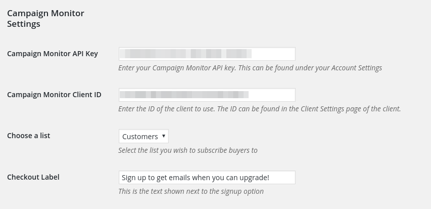 In the Extensions section of the Easy Digital Downloads Settings, you will have options to enter your Campaign Monitor API key, enter a Client ID, choose the email list to subscribe users to, and an option to define the checkout field label, as shown below: