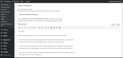 When a purchase is flagged as possibly fraudulent, an email can be delivered automatically to the site admin and/or to the customer in order to request additional information necessary for verifying the purchase. Once the purchase is reviewed by a site manager, the receipt and download links can be released to the customer. If the purchase is confirmed to be fraudulent, Fraud Monitor allows you to easily reverse the payment, preventing costly chargebacks or fraud penalties in the future.