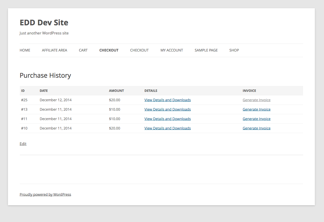 The Invoices extension provides a complete system for generating invoices for all customers. It allows you and your customers to create an invoice for any purchase in a nice and easy way. Invoices can include complete company details, such as name, address, and tax ID, that customers can use for accounting and tax purposes.