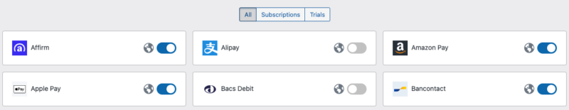 You can enable or disable Stripe Payment Methods within your Stripe settings. The methods actually displayed to your customers will vary based on multiple factors, such as currency, country, and what’s in their cart.