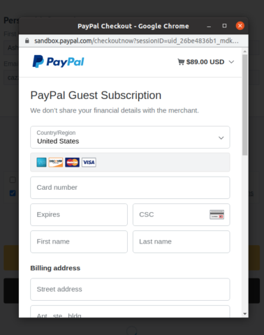 If the debit or credit card button is clicked, inline card fields will be displayed for the customer to complete.