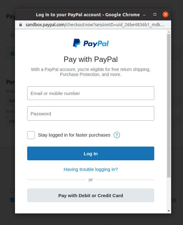 PayPal wallet payments keep your customer on your site without redirecting away to a PayPal page, which in itself can improve conversion rates. If the customer clicks the PayPal button, a modal popup will appear to prompt them to log in to their PayPal account and complete their purchase.