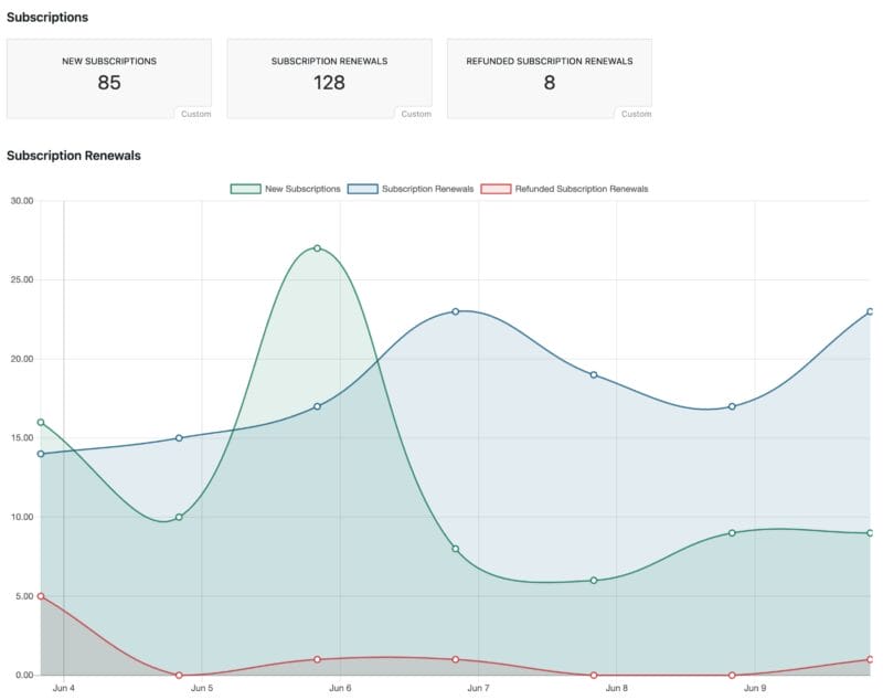 Track your recurring revenue through beautiful, easy-to-read earnings graphs. See a breakdown of new purchases alongside renewal payments to get a better picture of your returning customer sales.