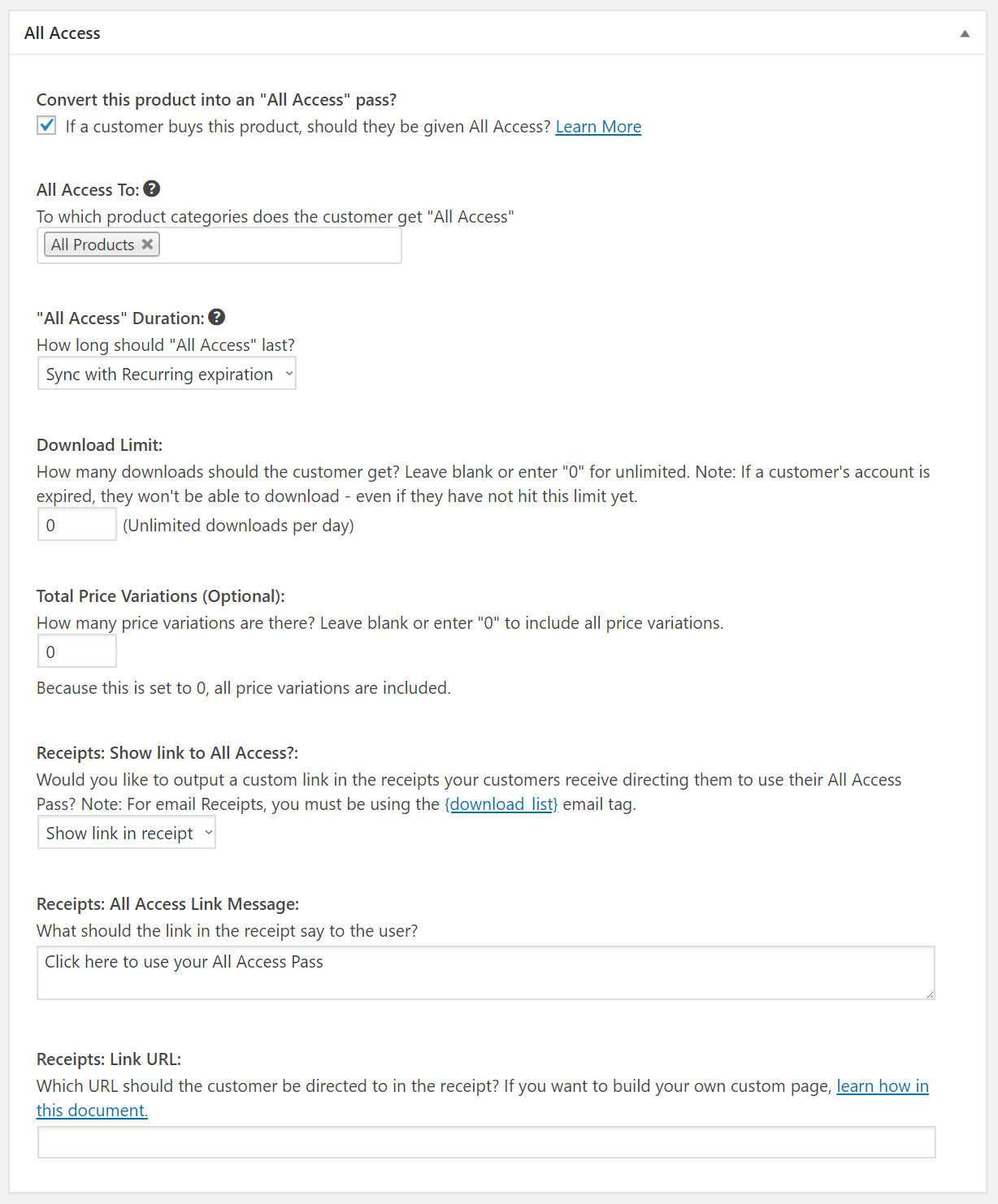 Optionally restrict file downloads of recurring products to just those customers with an active subscription. This way you can ensure customers who cancel their subscription no longer have access to your product downloads until they decide to purchase again or renew.