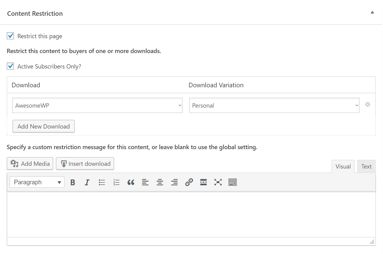 Recurring Payments is fully integrated with the Content Restriction extension to make it possible for you to restrict posts, pages, bbPress forums, etc. to only those users who have purchased specific products and have an active subscription that is not expired.