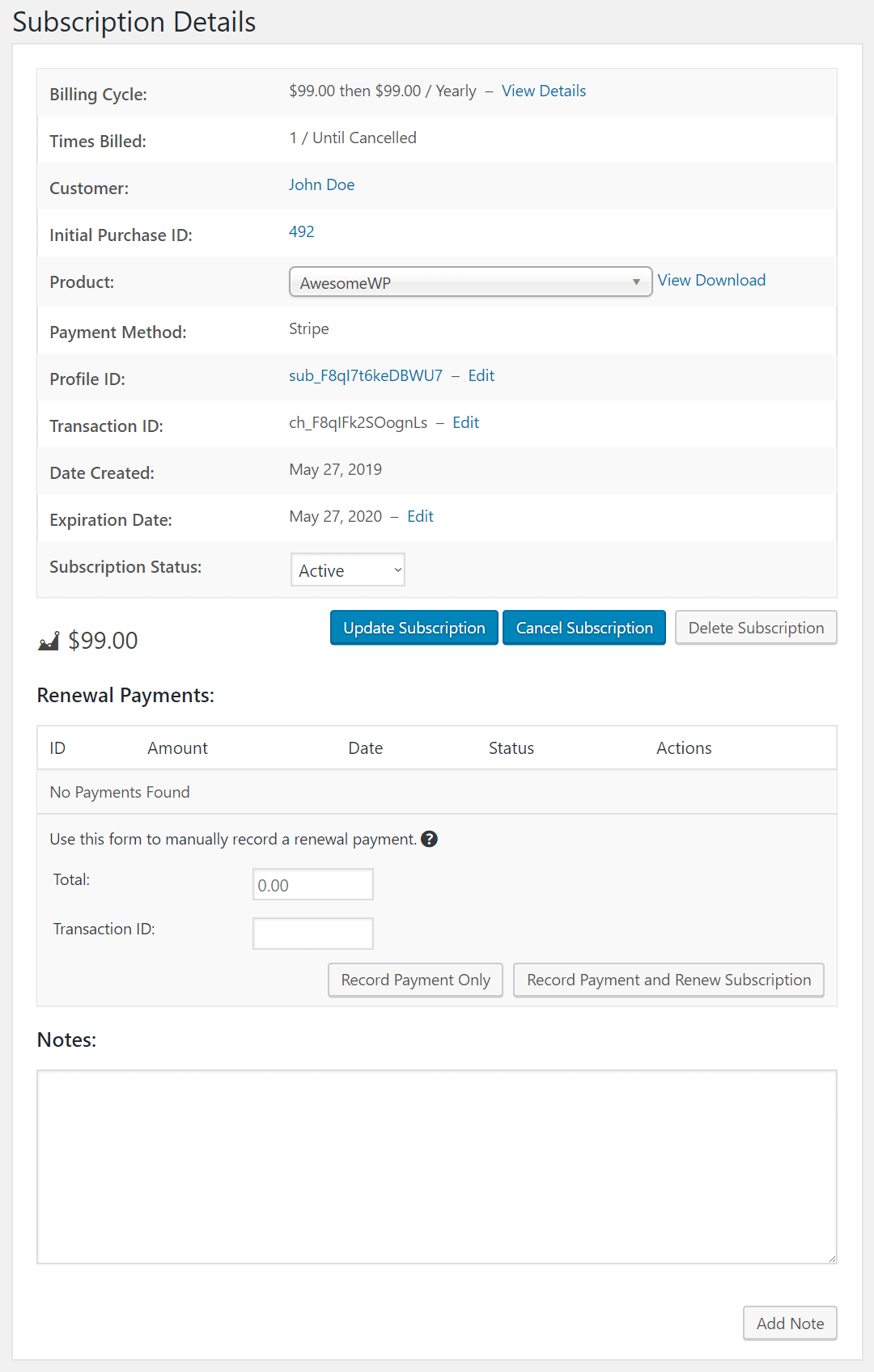 Select a subscription to drill in and find their payment in Stripe, PayPal, or other payment gateways. Manually change a subscription’s status, add notes and record manual payments with a couple of clicks.