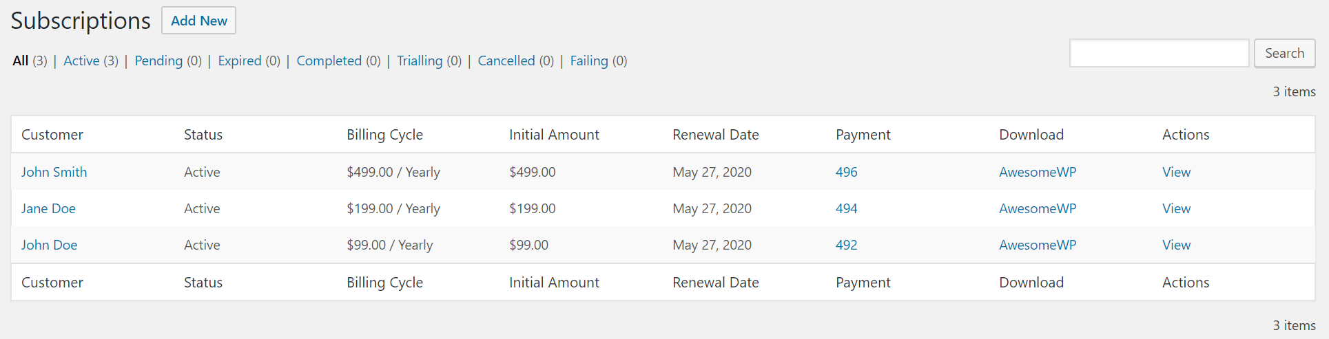 With a complete interface for viewing and managing subscriptions, taking care of your customers and keeping an eye on your subscriptions is simple. Search by customer or filter by subscription status such as active, pending, and cancelled.