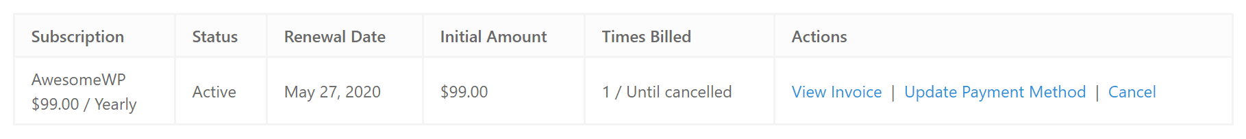 Your customers can have a complete dashboard for viewing and managing their subscriptions. After logging in they can view their invoice, update their payment method, cancel their subscription, or even renew recently expired subscriptions.