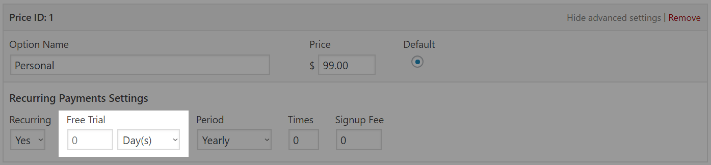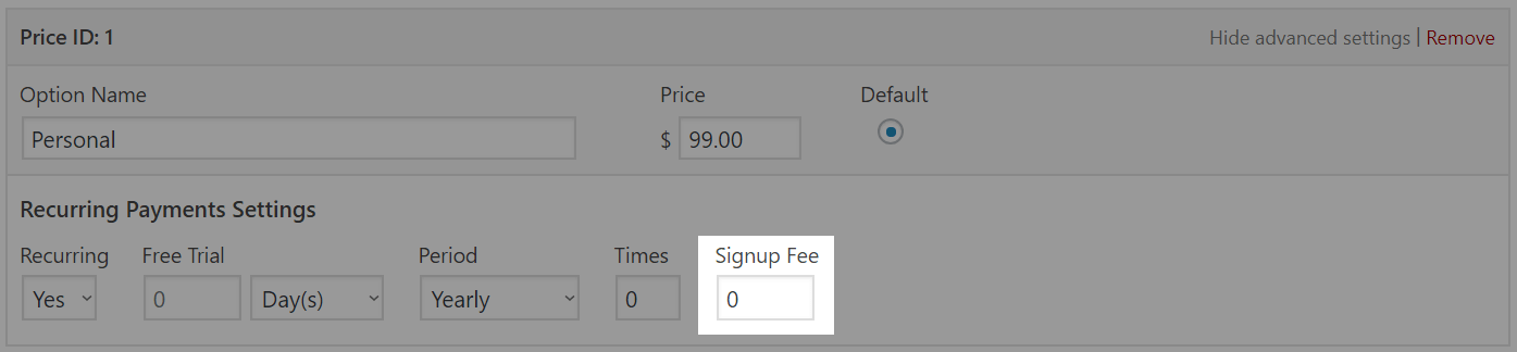 If you want to charge your customers a larger up-front payment, simply add a signup fee. For example, to charge subscribers $50 up front for a $20 per month product, just add a $30 signup fee.