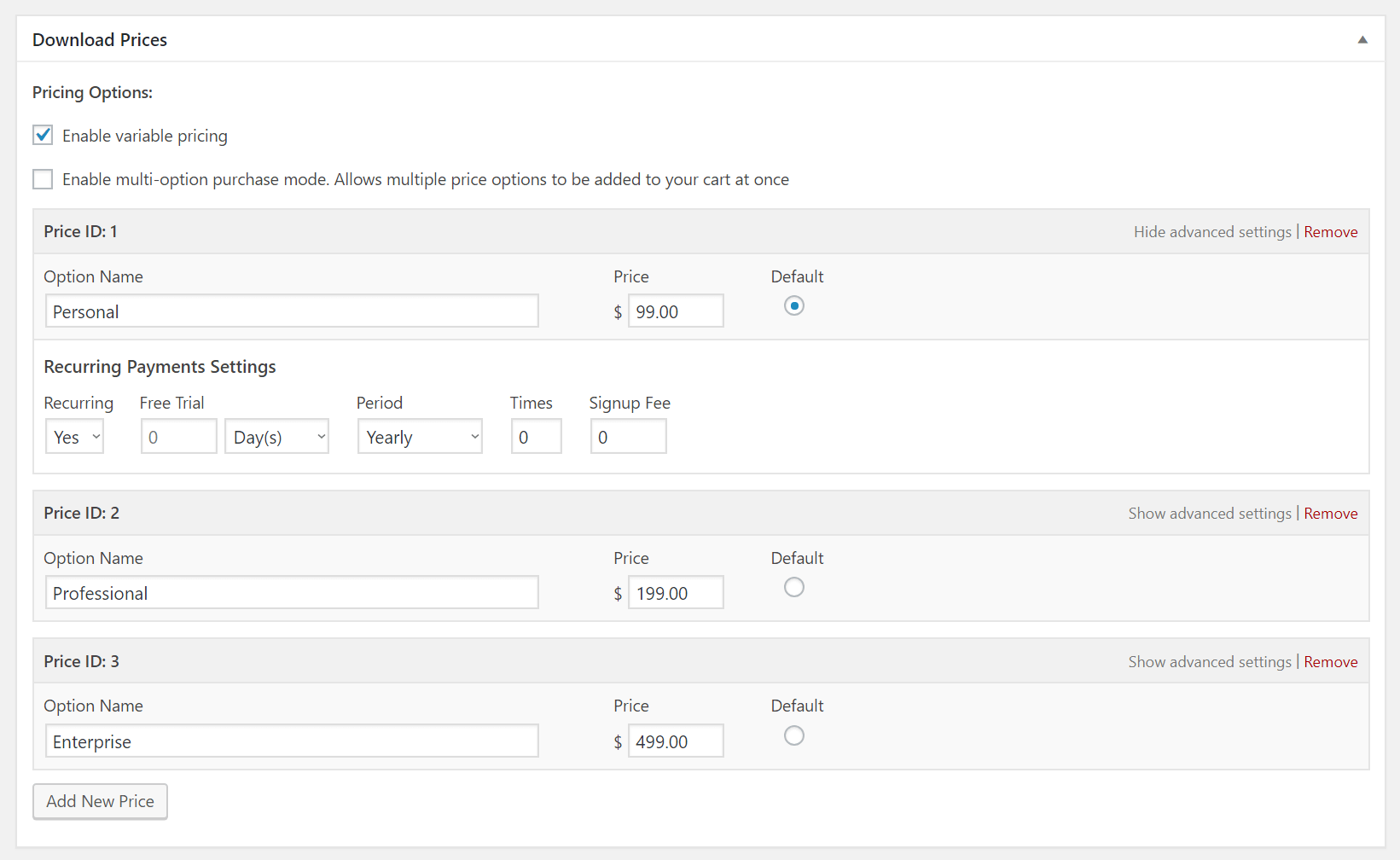 You can easily adjust the recurring periods, the number of times they recur, and how much they cost. Products with variable pricing can have recurring and non-recurring price options.