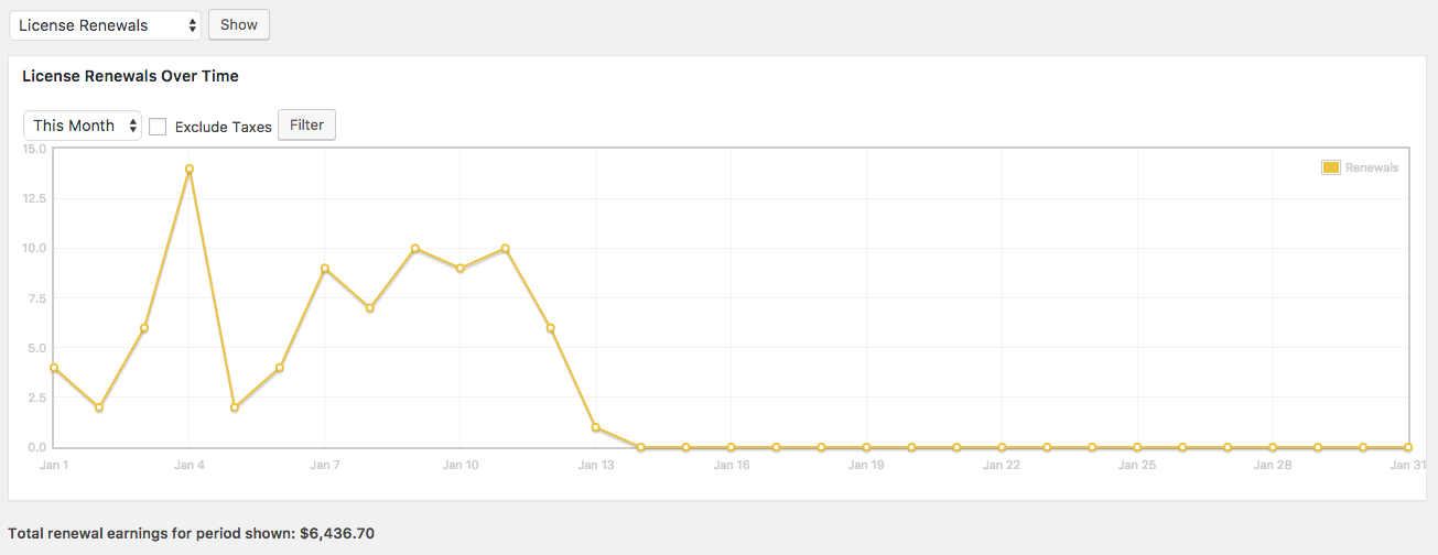 Software Licensing also provides a complete reporting view that displays a graph of license renewals and earnings from those renewals over time so you can better understand how many customers renew their licenses.
